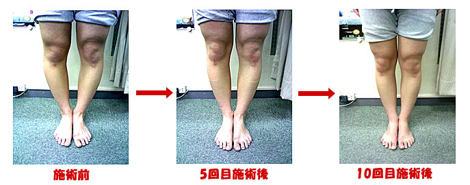 | 膝の隙間よりふくらはぎの隙間がかなり広く膝下がたわんで見えるタイプのO脚。 10回の施術でたわんだ感じが少なくなり足も少し細くなりました。安定化させるために継続施術中。 |