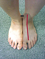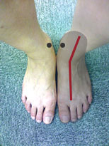 | ウチマタ型タイプ2の特徴 ・足先を開いて立っても閉じて立っても隙間は余り変らない。 ・太ももの隙間から膝の隙間見かけて徐々に大きくなっている。(上の図参照) ・親指をつけて立つと内くるぶしはあたらずその下の骨があたり、踵がつかない。(右写真参照) ・膝がしっかり伸びず、少し曲げ気味。 (平らなところに座って膝を伸ばした時に膝裏に隙間が出来、ピッタリつかない) ・膝蓋骨が明かに内側に向いている ・多くは2.5cm以上、まれに2cm以内 | ![]() |
